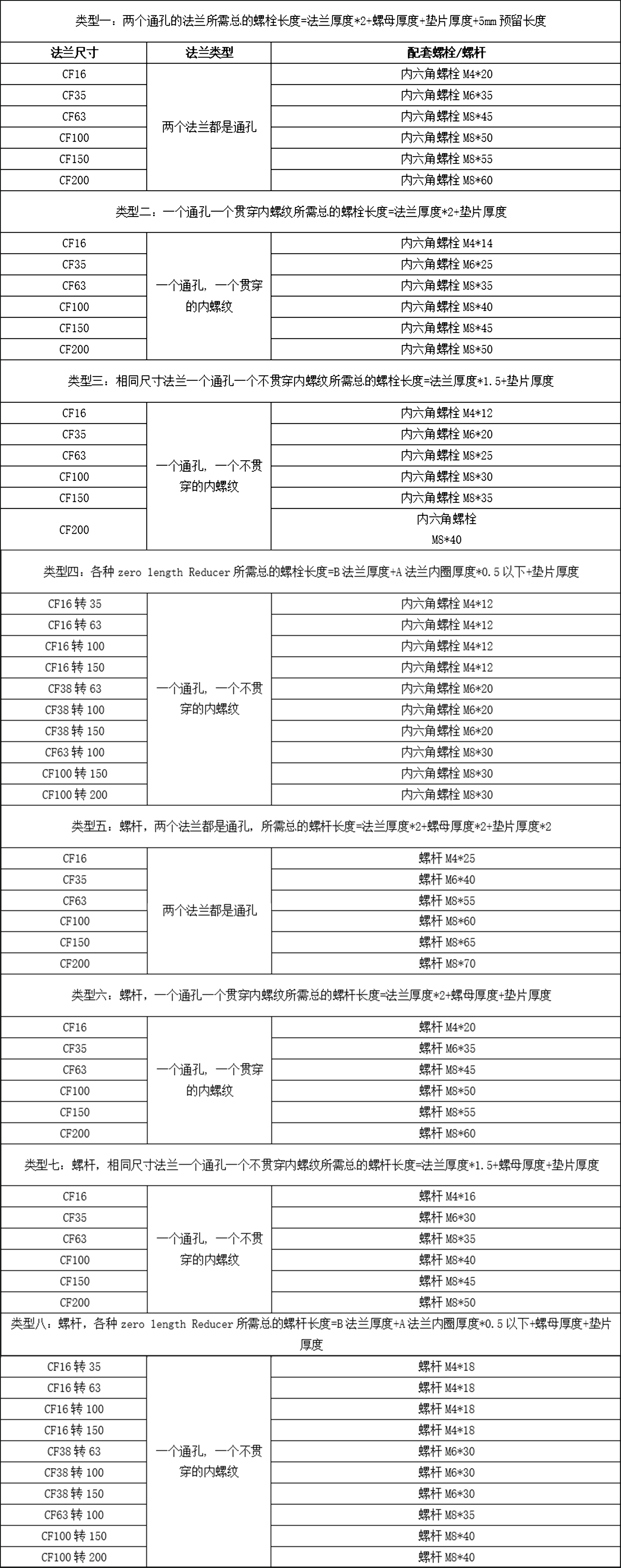 The following is the table of bolt/screw lengths corresponding to the CF flange sizes commonly used by Feminian Instruments (for reference only)